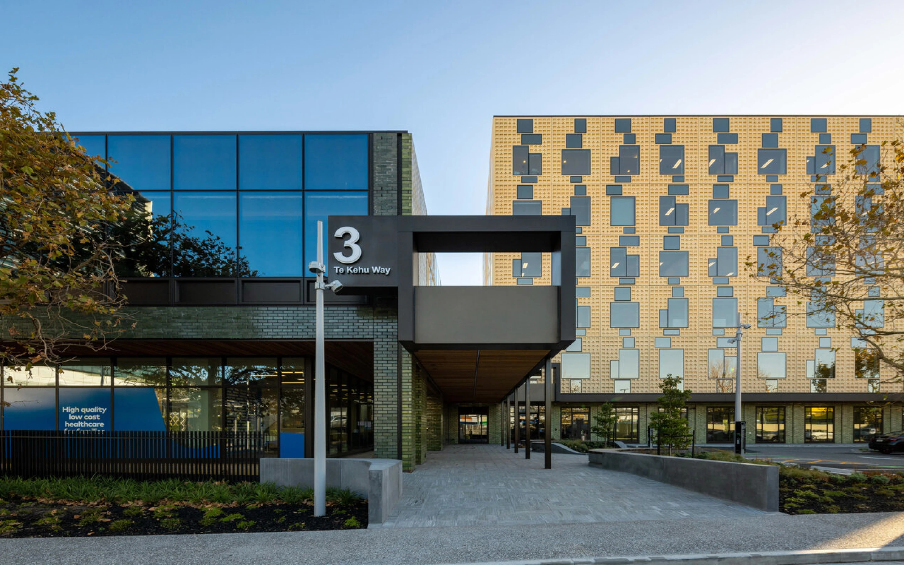 Research showed that the Mt Wellington area in Auckland, was formerly a pūriri broadleaf forest ecosystem. With this in mind, 4 shades of green glazed bricks, custom-made for the project, were chosen for the base of the main building and the 4 faces of the of the facade of the Southern low-rise pavilion. Laying each wall, in 1 of the 4 different shades of green, you walk around the building moving alongside brighter or darker walls. Viewed from a distance the windows in the high-rise have also been placed in a pattern, creating rivers running down the façade, into the green glazed of the forest.