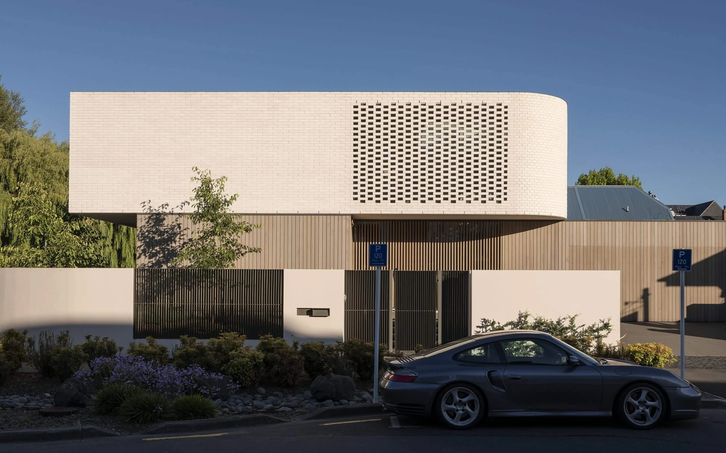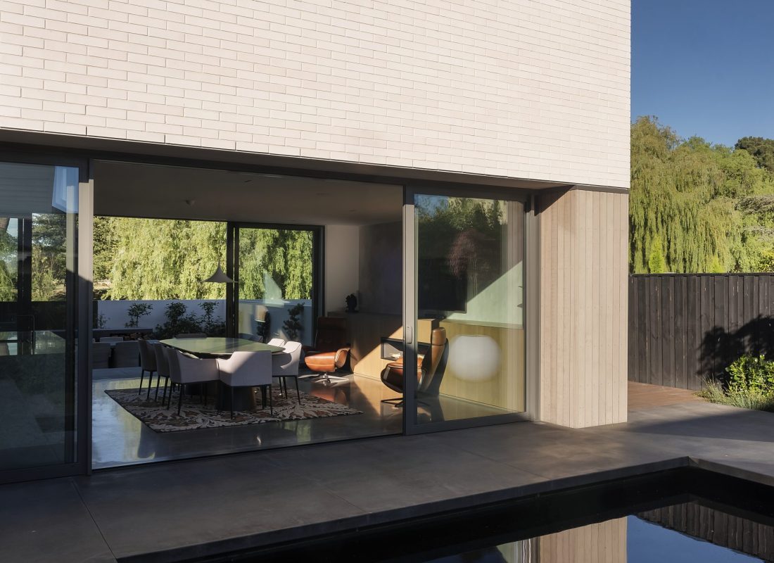 On a busy street corner, opposite a lively park, sits a quietly, different home. It stands out for all the right reasons. A sculpture, made of mellow timber and natural kiln fired clay bricks, is a piece of art down the street. The off-white, curving brick mass seems to hover, like a cloud, as the warm timber ground floor, melds away before your eyes. Utilising screening, with the bricks and the timber, Common have played well with the need for privacy versus views and light for their client. Creating lovely dappled light inside from sunlight and water reflections. The custom-made King 290x68x70 brick, also brings a more linear, layered look, than a standard size brick. Slayney Masonry showing their artisanal skills with the beautiful curved walls and technical screens.