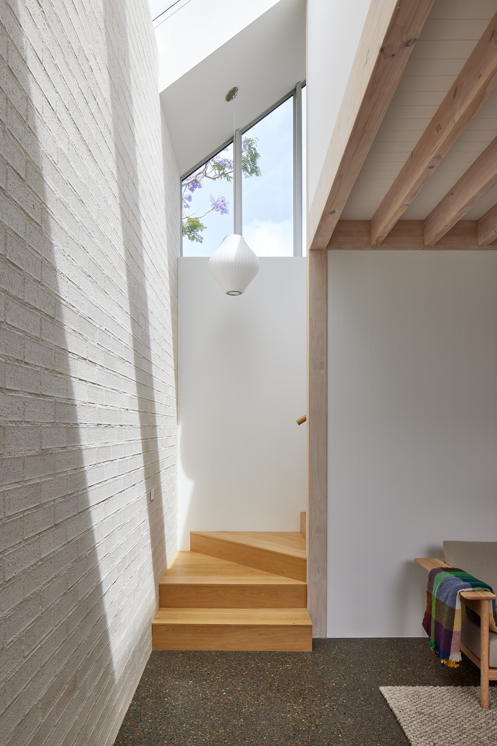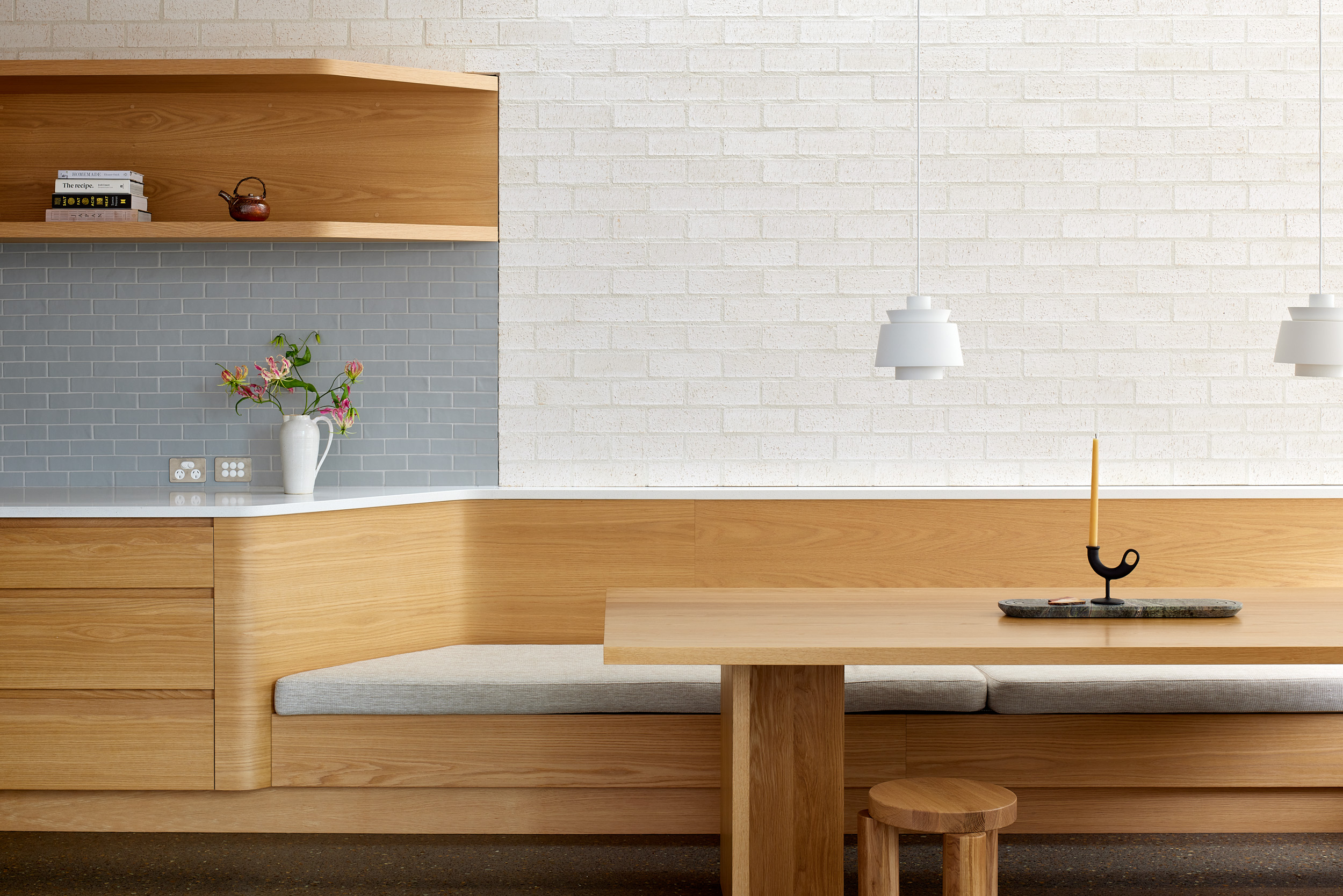 Brick, oak, polished concrete, painted board and batten cladding, and glass were selected for their simplicity, durability and textural richness, and assembled in a carefully considered way. The bricks were beautifully laid by CWF Brick and Block layers Ltd both inside and out, solidifying this light airy home. The off-white Aoraki brick has light cream tones coming through in the natural variation of the brick, which works brilliantly with the warm oak.